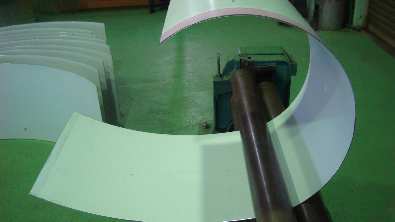 複数のローラーの間に板材を通し、曲面形状に曲げて円筒形に加工します。