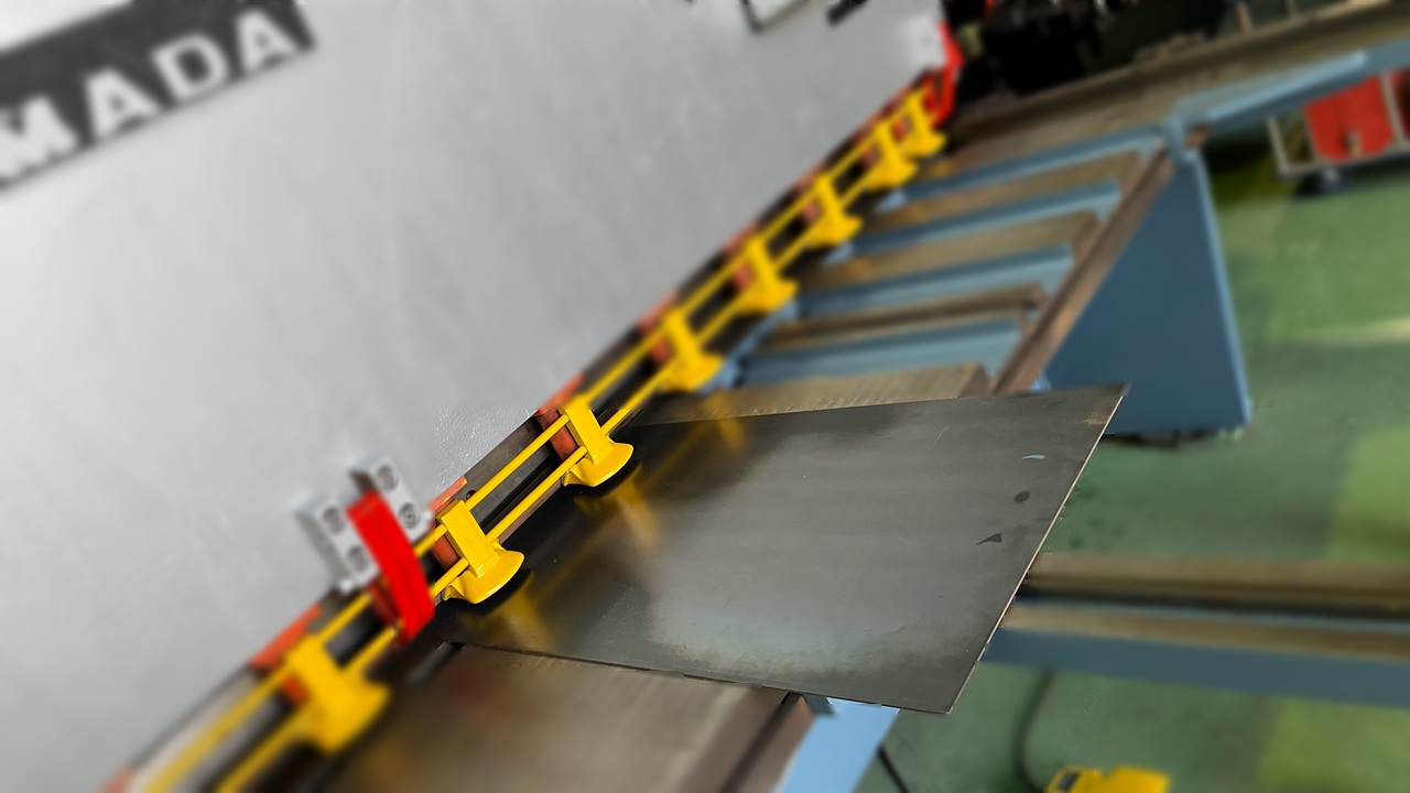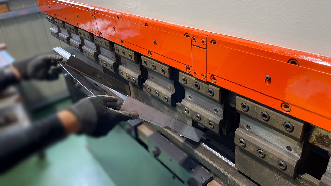 切断・抜き加工を行った板を、ベンダーを用いて折り曲げます。